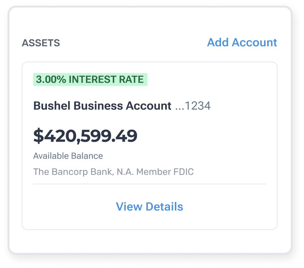 2The interest rate for the Bushel Business Account is variable and may change at any time. The disclosed interest rate is effective as of November 3, 2025. The interest rate displayed is representative and may not reflect the current interest rate.